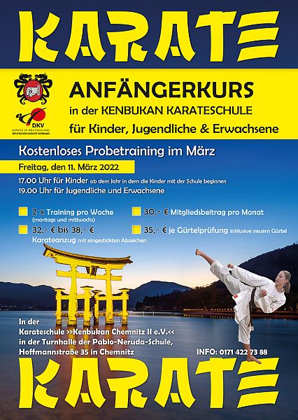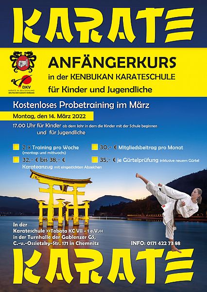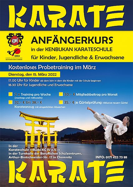 Unsere Vereine bieten im März in ganz Chemnitz Karate Anfängerlehrgänge für Kinder ab der ersten Klasse, Jugendliche und Erwachsene. Info: 0171 / 422 73 88